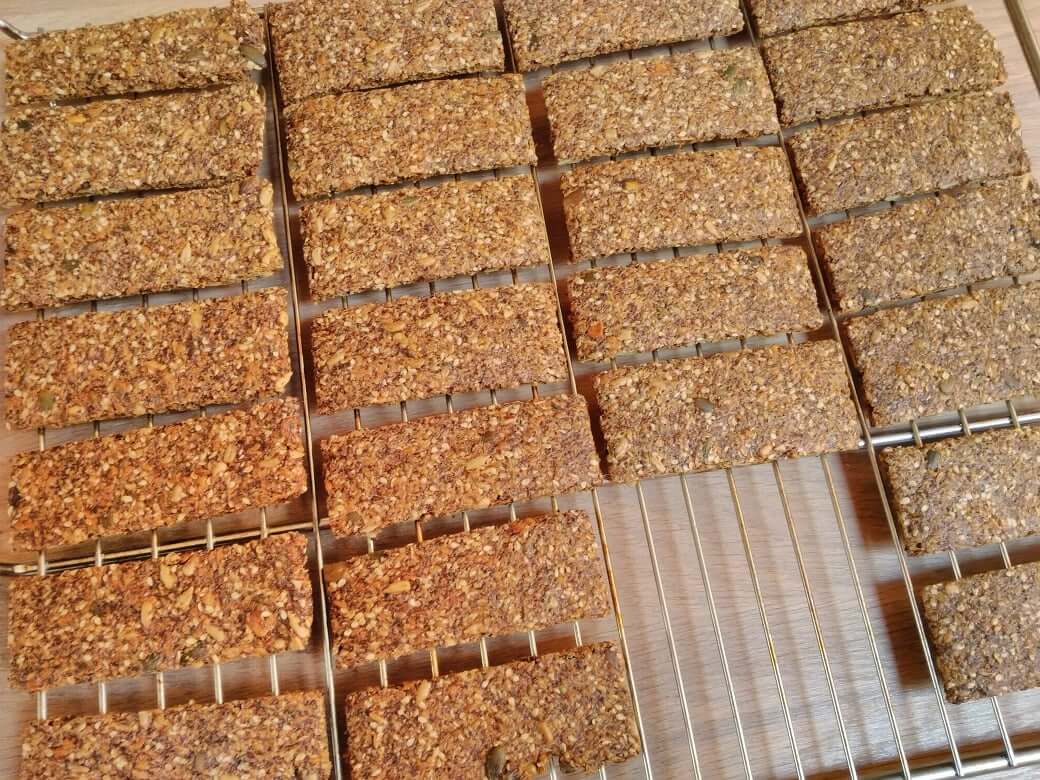 Semená preženiem cez mlynček na cereálie (nemusí byť). Nechám bokom 50 g tekvicových, slnečnicové a konopné, nech je do čoho hryznúť. Všetko zmiešam, nechám postáť 5-10 minút a rozotriem na papierovú alebo silikónovú podložku veľkosti veľkého pekáča. Ešte pred pečením narežem na akurátne kúsky - po upečení sa ľahko nalámu. Pečiem v teplovzdušnej rúre na 140 °C, trvá to 1:30 hod. Na záver ich dosuším vo vypnutej rúre. Časť hotových krekrov zamrazím.